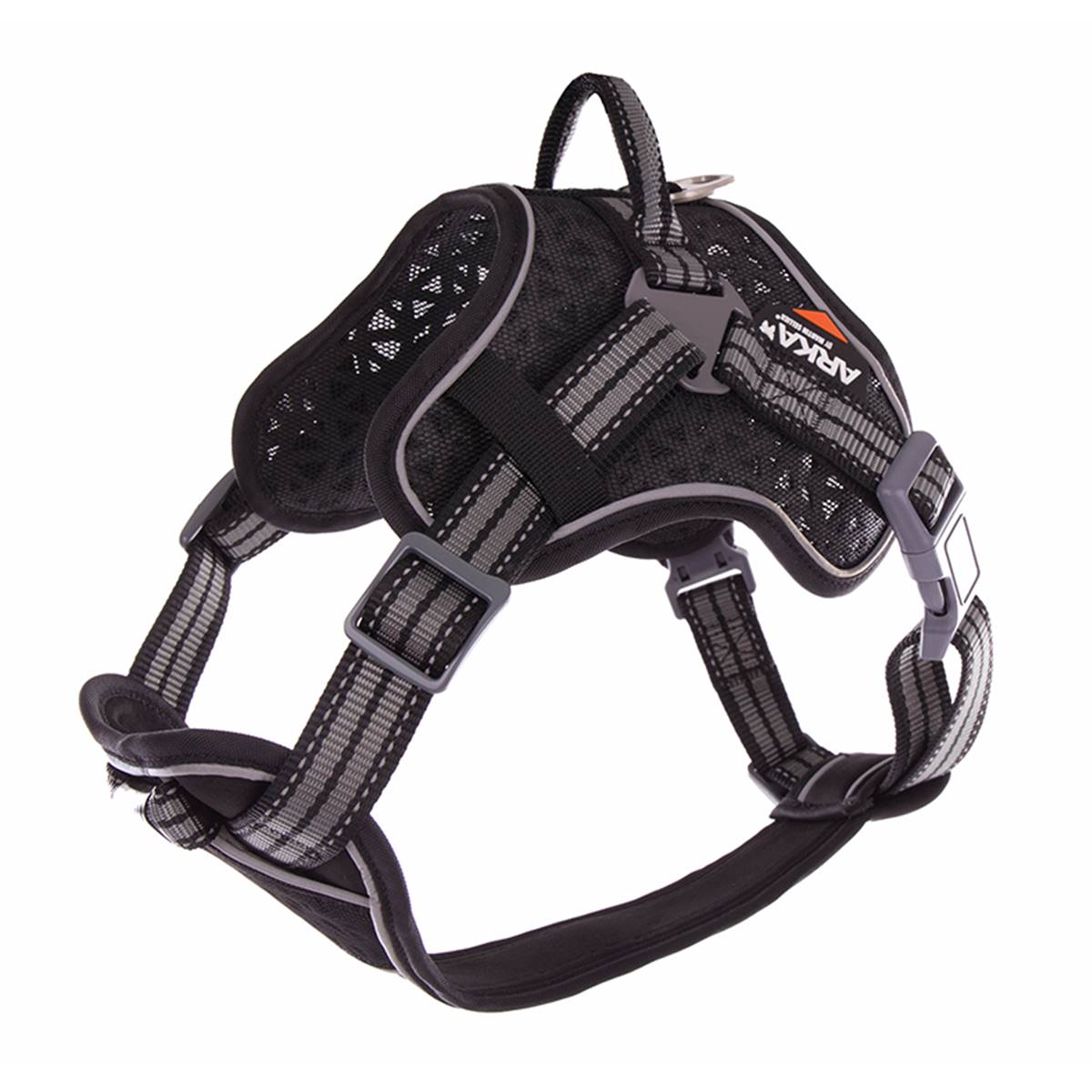 Le harnais Arka Dog est ajustable et multisports : légèreté, efficacité et confort. Combinaison de matières laissant respirer la peau de votre chien : sangle en nylon très résistante, mesh léger et renfort en néoprène. Le renfort ventral en néoprène offre une meilleure protection lors de l’effort. La poignée dorsale avec un anneau en métal pour attache de la laisse permet une prise et un contrôle rapide de l’animal. Les sorties nocturnes sont plus sûres grâce aux bandes réfl échissantes.