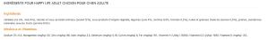 Viandes et sous-produits animaux (poulet 12%), céréales (maïs 4%, riz 4%), sous-produits d’origine végétale, légumes (pois 4%, carottes 0,5% et tomates 0,5%), huiles et graisses (huile de saumon 0,5%), graines, substances minérales, levures, fruits (pommes 0,5%)