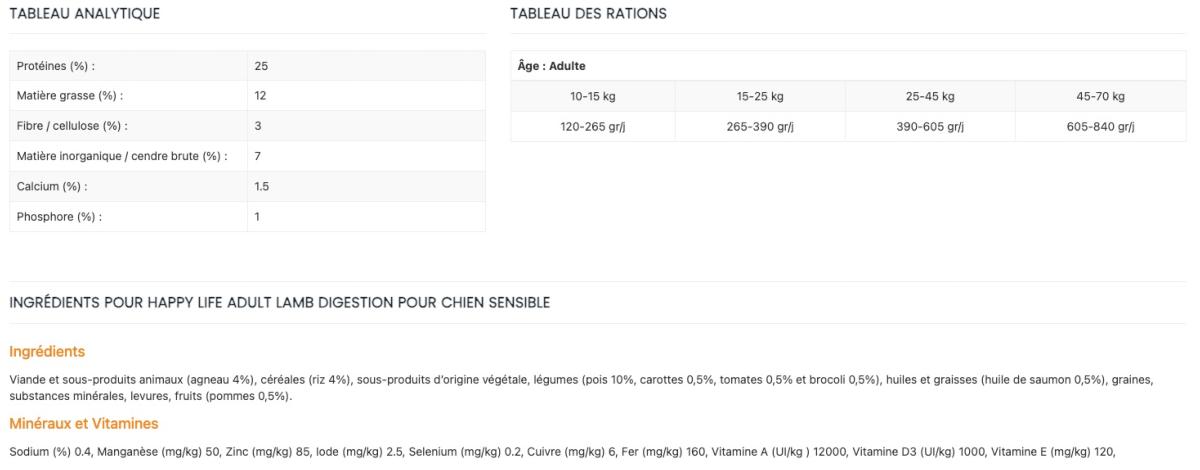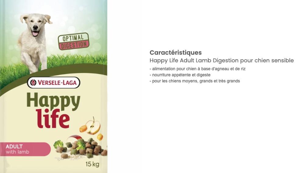Happy life Adult à l'Agneau est un aliment délicieux et varié à base d'agneau qui fournit tous les éléments nutritifs nécessaires à la vitalité du chien adulte