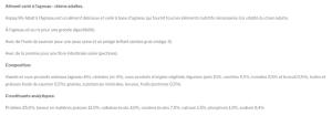 Protéine 25,0%, teneur en matières grasses 12,0%, cellulose brute 3,0%, cendres brutes 7,0%, calcium 1,5%, phosphore 1,0%, sodium 0,4%